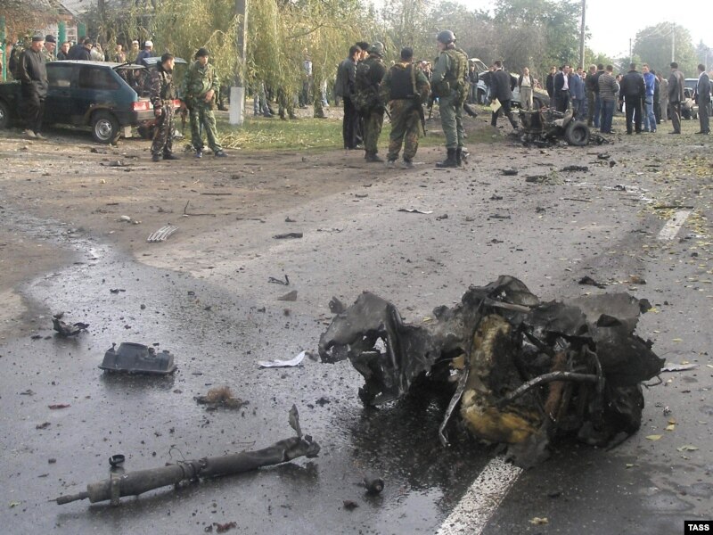 На месте взрыва легковой машины с террористом, подорвавшим себя во время проезда колонны министра МВД Ингушетии, 30 сентября 2008
