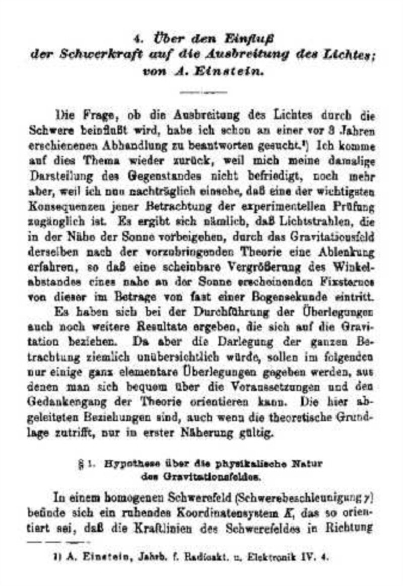 Титульная страница написанной Эйнштейном в Праге статьи о влиянии гравитации на распространение света