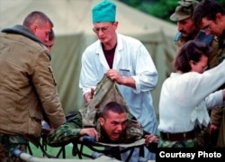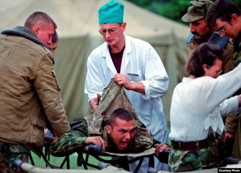 Первое, чего не умеют наши журналисты – это оказывать первую медицинскую помощь. Что делать счеловеком, которому оторвало руку или ногу, у которого проникающее ранение, который жевал на ходу бутерброд, подорвался на мине, и как не дать ему умереть, чтобы он не захлебнулся сразу тем, что он жевал – вот этому там учат. Как транспортировать раненых, как перевязывать, и все реально совершенно – с брызжущей кровью... Неделю там всех учат. Только после этого агентство имеет право отправить человека в зону боевых действий.