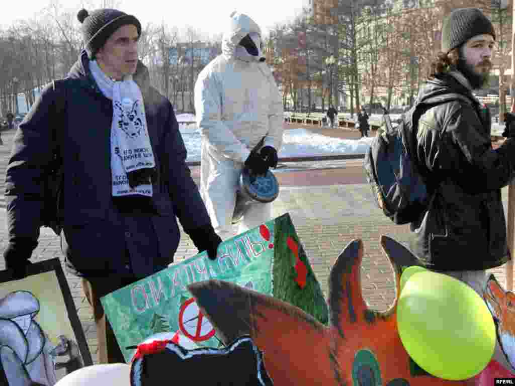 Солист группы "Сценакардия" демонстрирует, что лучше стоять на морозе в одной майке, чем носить на себе трупы животных.