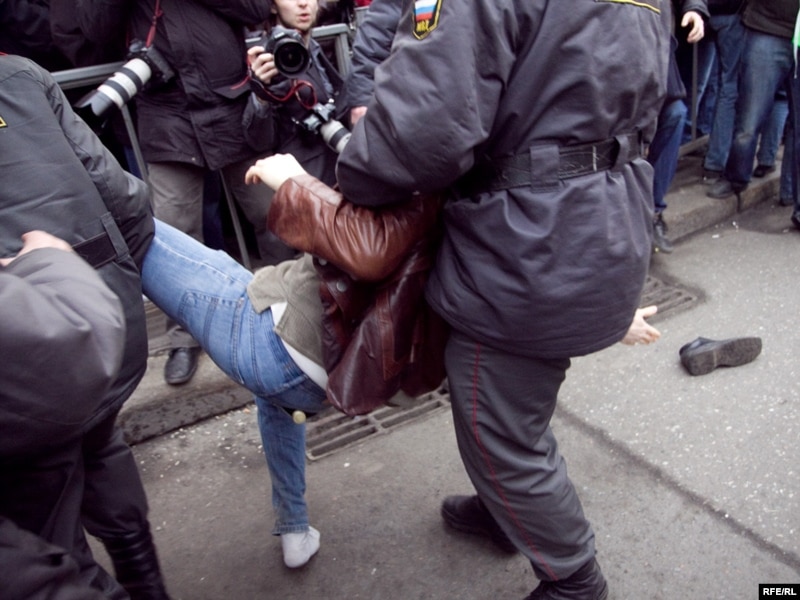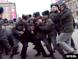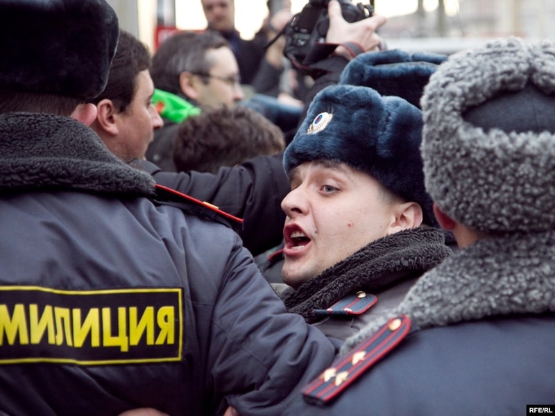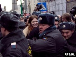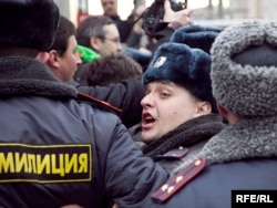 Сотрудники милиции во время разгона акции за свободу собраний на Триумфальной площади в Москве.