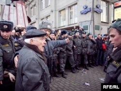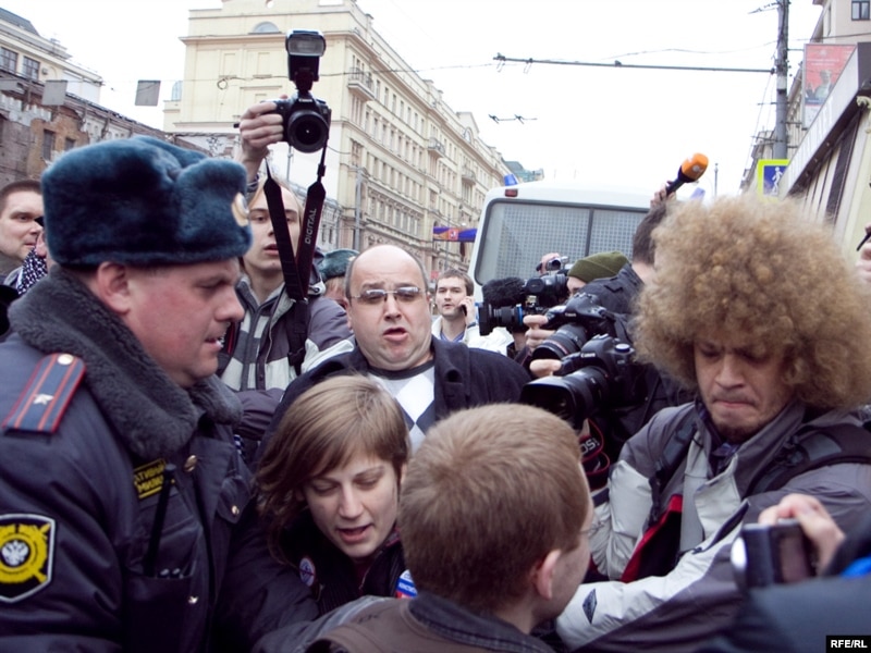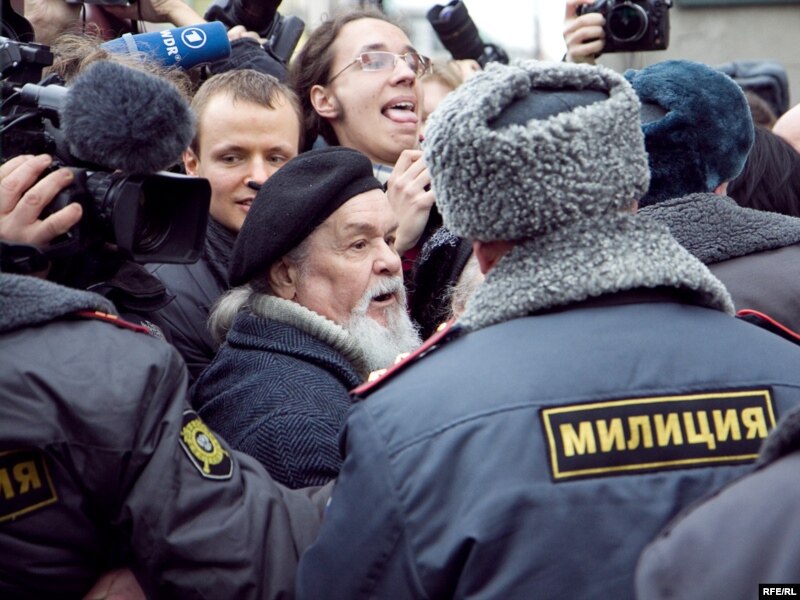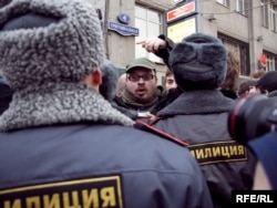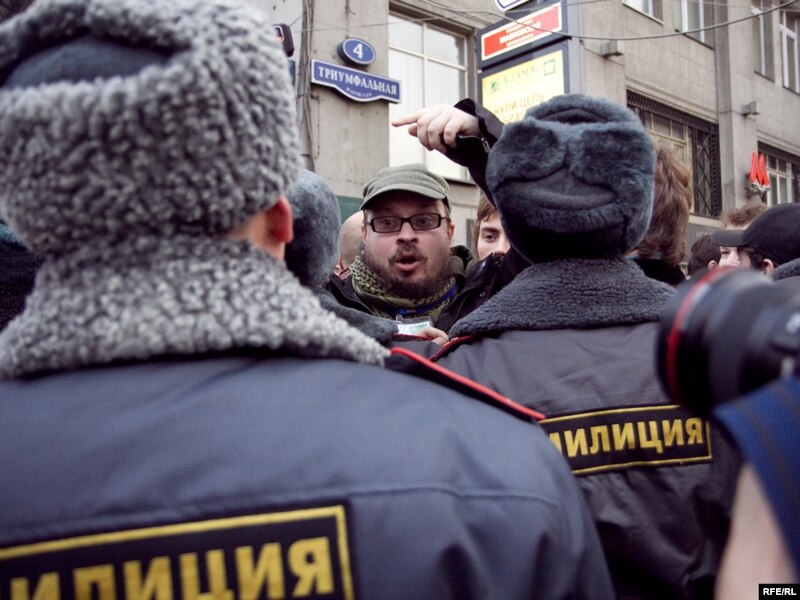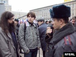 Лев Пономорев объясняет милиции, что задерживать просто за нахождение на площади неправильно