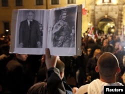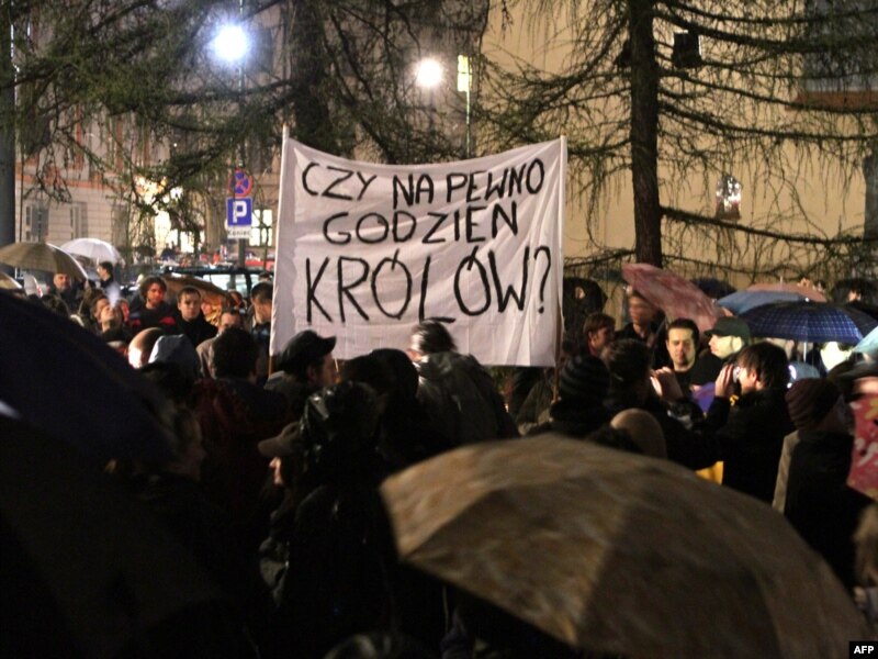 Митинг против захоронения президента Леха Качиньского с супругой в замке Вавель. Надпись на плакате: "Достоин ли он королевских похорон?"
