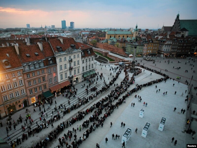 Между тем прощание с Лехом Качиньским и его супругой продолжается уже третий день. Для того, чтобы войти в президентский дворец, нужно стоять в очереди около 8-10 часов. Тем не менее желающих отдать дань уважения главе государства все больше.