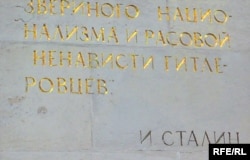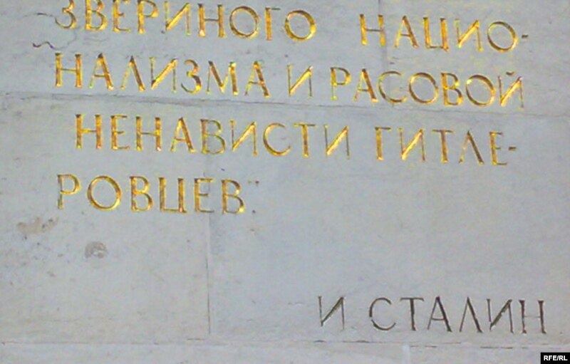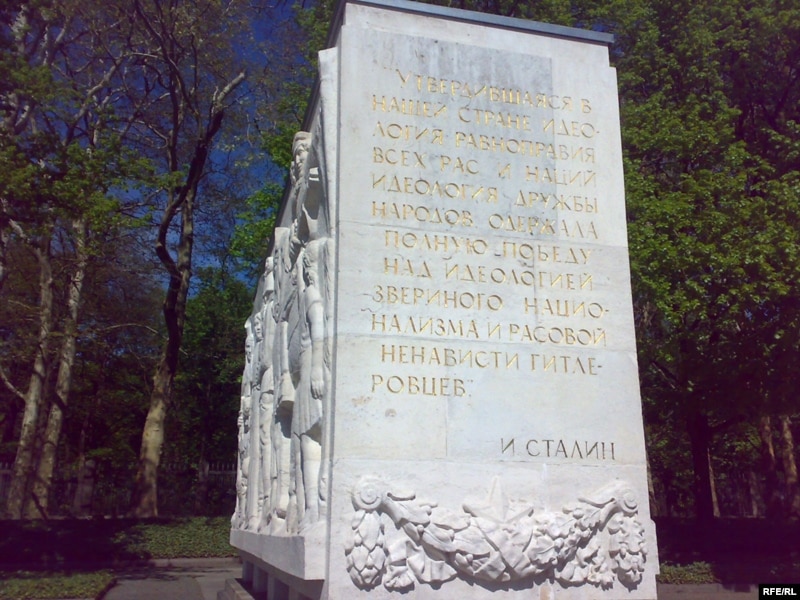 Созданый в 1949 году в берлинском Трептов-парке мемориал, посвященный павшим в боях за Берлин советским воинам, знаменит своей скульптурой солдата, держащего на руках спасенную им немецкую девочку. В центре комплекса в пяти братских могилах покоятся останки нескольких тысяч воинов. Слева и справа поле перед монументом обрамляют символические саркофаги, по 8 с каждой стороны. На них – барельефы и на торце каждого – цитата из Сталина. 8 цитат по-русски с одной стороны и они же по-немецки – с другой. Но вот что бросается в глаза. Ни на одной из стел имя Сталина, в отличие от самого текста, не позолочено, причем видно, что когда последний раз позолоту обновляли, фамилию генералиссимуса явно и намеренно позолотить "забыли".