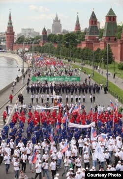 Приезжаю к Храму Христа Спасителя, от которого и должен начаться крестный ход. Гаишник говорит - иди на набережную, строятся все там, только там уже все перекрыто. Действительно, перекрыто, но еще пускают. Действительно, строятся. Представители трудовых коллективов, студенты институтов, представители молодежных организаций, ветераны войны и труда, физкультурники и спортсмены. В конце колонны - представители столичных округов, строго в алфавитном порядке. Возглавляет шествие градоначальник, замыкает большая колонна "России молодой". Звона колоколов не слышно из-за громкой песни "Дорогая моя столица..."