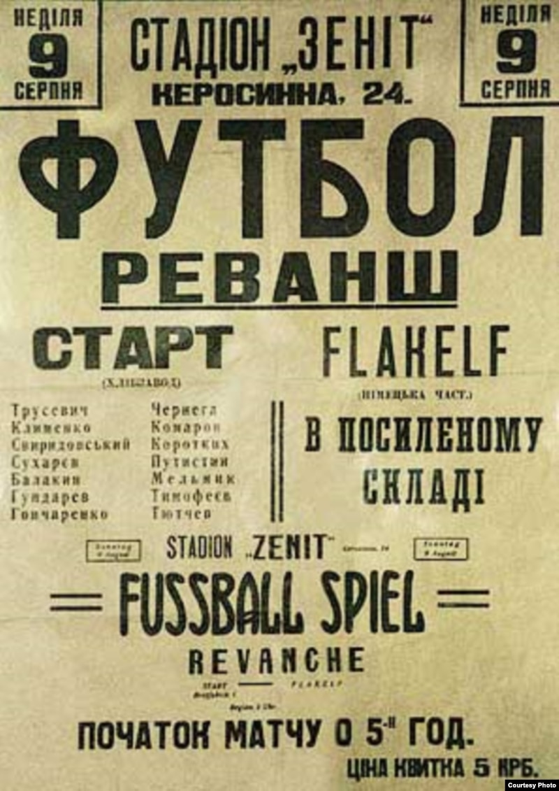 Немцы пытались наладить в городе культурную жизнь. С их подачи было организовано украинское спортивное общество "Рух". Свои команды сколотили и венгерские охранники железных дорог, и румынский гарнизон… Была организована футбольная команда и на хлебозаводе №1, директор которого Йозеф Кордик был давним болельщиком "Динамо". Случилось так, что на "бирже труда", которая располагалась на Евбазе, Кордик встретил Николая Трусевича: бывший вратарь до "Динамо" – еще в Одессе – закончил пищевой техникум. Это и способствовало тому, что Трусевич и еще семеро футболистов, отыскавших друг друга в оккупированном городе, стали грузчиками на хлебзаводе... Команду назвали "Старт".
