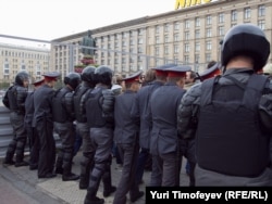 На площади - не менее 200 милиционеров, которые курсируют вдоль забора, огораживающего площадь. Часть из них вооружена дубинками, на многих - шлемы и бронежилеты.