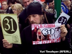 В мегафон звучит: "Уважаемые граждане, проходите, не мешайте проходу людей в метро". Много журналистов. В том числе главный редактор "Эха Москвы" Алексей Венедиктов. Есть и первый участник акции - Нина Семеновна всегда приходит 31-го на акции оппозиции с листком, на котором написана цифра "31".