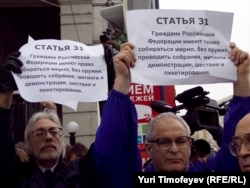 Задержаны не менее десятка человек. Среди них - активисты Левого фронта. Все они стояли на площади с плакатами. Один из таких плакатов, например, содержал текст 31-й статьи Конституции. Впрочем, были и другие: "Россия без Путина", "Долой власть чекистов!". В момент каждого очередного задержания собравшиеся на Триумфальной скандировали: "Свободу! Свободу". В эти минуты задержания участников акции продолжаются.