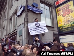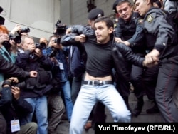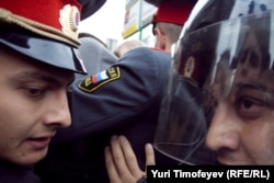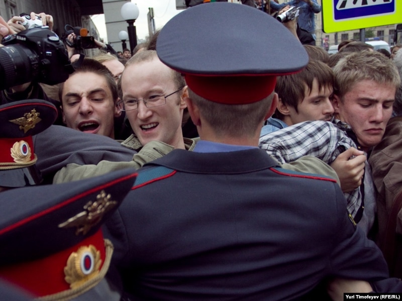 Главный редактор радиостанции "Эхо Москвы" Алексей Венедиктов объясняет милиционеру, что он просто стоит
