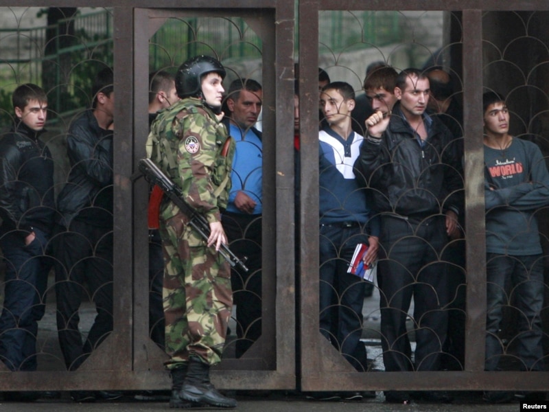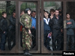 Люди за оцеплением к центрального рынка Владикавказа, 9 сентября 2010