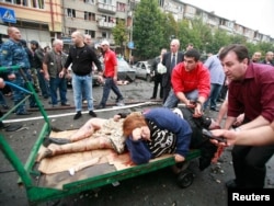 Люди помогают пострадавшим при взрыве на центральном рынке Владикавказа, 9 сентября 2010