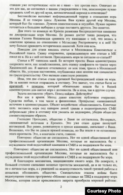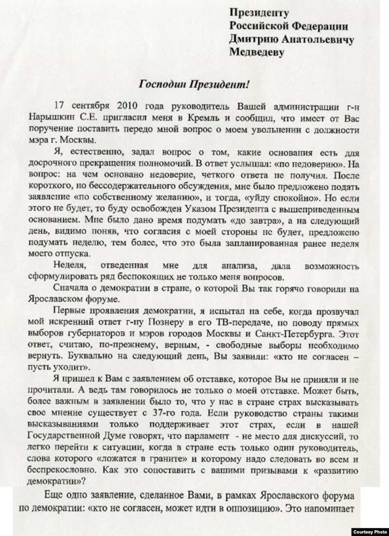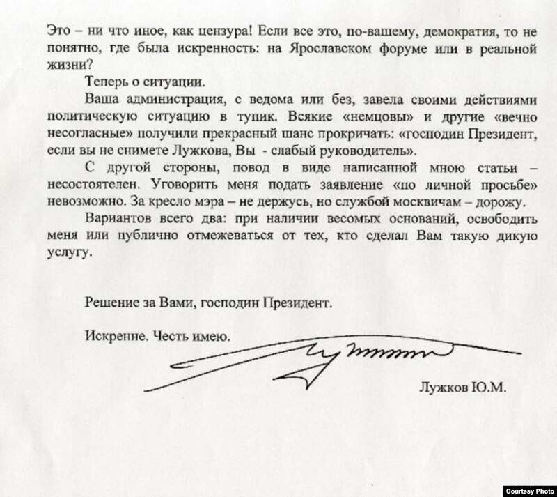 Журнал The New Times опубликовал письмо, которое накануне отставки мэр Москвы якобы направил президенту Дмитрию Медведеву. Сайт журнала был некоторое время недоступен - то ли не выдержал притока посетителей, то ли у этого сбоя есть иные причины. В этой ситуации сайт Радио Свобода считает возможным дать то же факсимиле, размещенное коллегами.