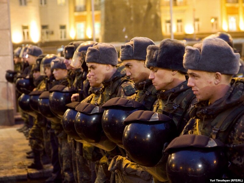 Через 20-30 минут после начала задержаний солдаты, построившись в цепочку, вытеснили участников акции и журналистов с площади
