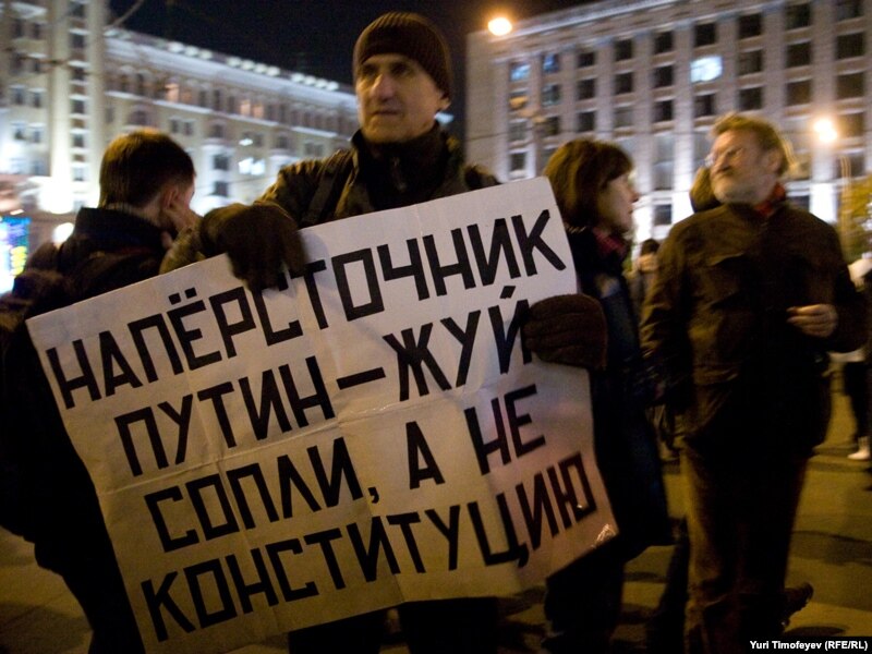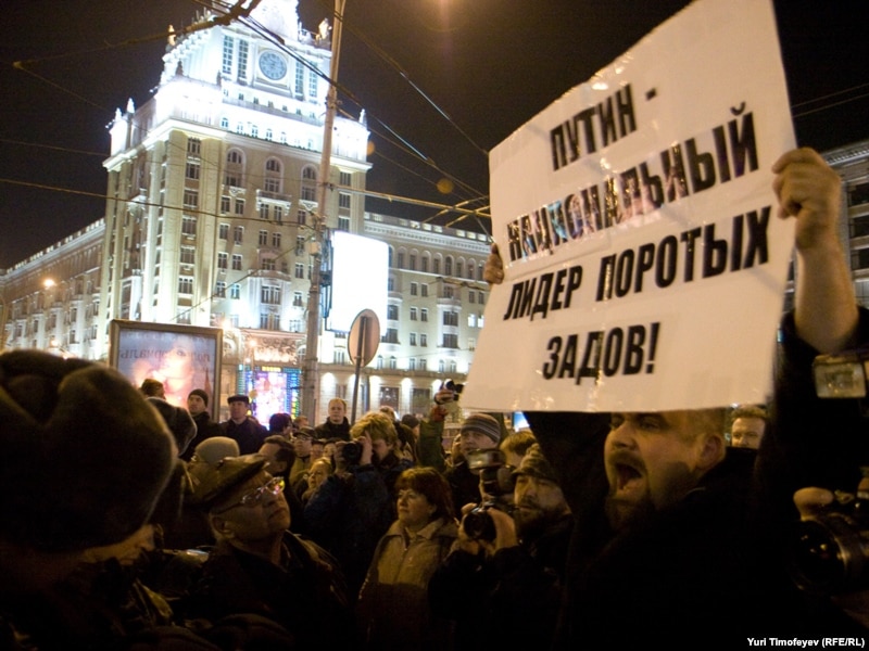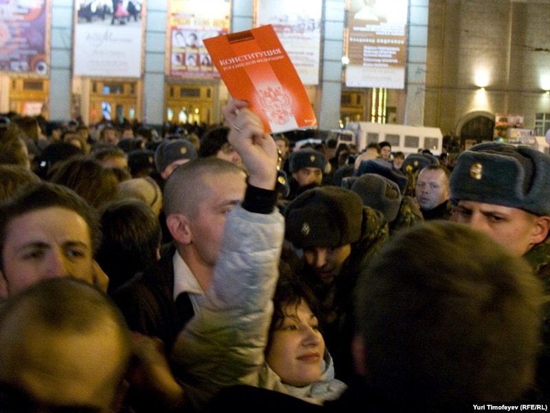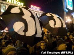 В Москве на Триумфальной площади прошла акция движения "Стратегия 31" в защиту 31-й статьи конституции, гарантирующей гражданам свободу собраний.