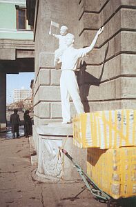 По верхнему периметру зала ожидания вокзала "Новосибирск-Главный" - балюстрада: галерея с гостиничными номерами. Красиво, но номера без сортиров, и командировочные в исподнем идут по нужде на виду у пассажиров. Внизу дивно переместились статуи. Ниши, в которых они стояли, пустуют, а скульптуру перенесли на перрон, и теперь поезда встречает полный парковый комплект: девушка с книжкой, школьник со скрипкой, пионерка в салюте, младенец с флажком.