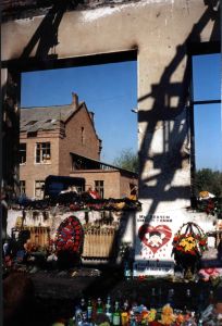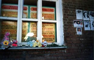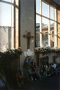 Елена Фанайлова: Голый кирпичный закопченный каркас, выбитые стекла, крыша покорежена взрывом... Бесланская школа номер 1 на глазах людей стала мемориалом скорби. Горожане ходят сюда каждый день. Школа обложена по периметру живыми цветами, сгоревший пол спортзала выложен венками. На стене - распятие. Все это кажется моментальной фотографией ада.