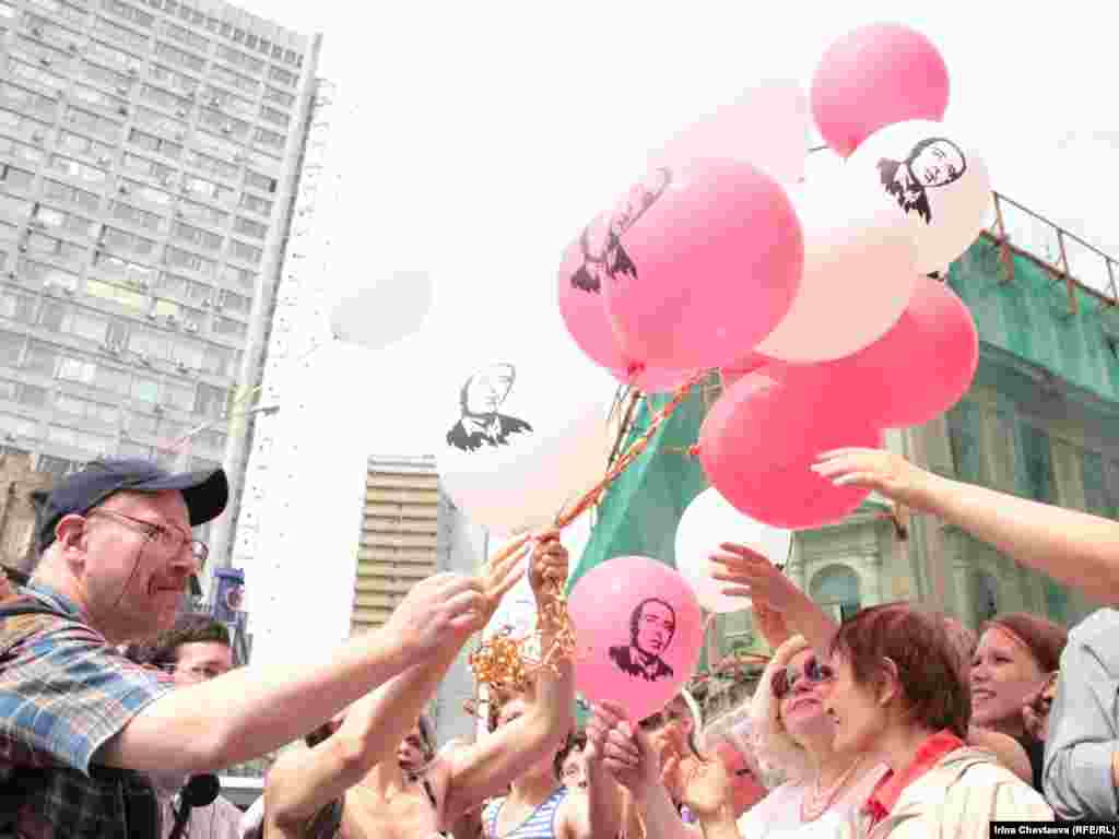 Несколько десятков человек с воздушными шарами и в майках с портретом Михаила Ходорковского колонной пошли по Арбату 26 июня, раздавая подарки прохожим. Таким образом они поздравили Ходорковского с днем рождения. Сотрудники полиции сопровождают колонну, некоторые участники акции были задержаны.