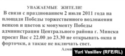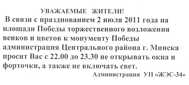 2 июля, Минск. Возложение венков к обелиску Победы на площади, собственно, Победы; центр города, годами отлаженная церемония. По рассказам жильцов прилегающих домов по проспекту Независимости, изъятия охотничьего оружия – даже у тех, кто живет в квартирах, обращенных во дворы – уже давно стали практикой (и даже объяснимой, со всеми допусками на менталитет любой службы охраны). Однако в нынешнем году у тех, кто живет вокруг площади, потребовали "не открывать окна и форточки, а также не включать свет".