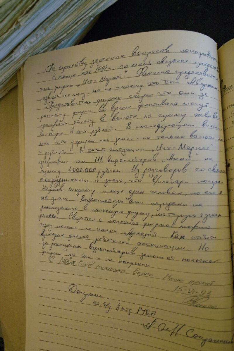 "В конце мая 1992 года со мной связался представитель фирмы "Ист-Маркет". Представитель фирмы сказал, что они за рекламу фирмы во время фестиваля могут произвести оплату в валюте, на сумму эквивалентную 8 миллионов рублей. В последующем выяснилось, что у фирмы нет денег – не только валюты, но и рублей. В этой ситуации "Ист-Маркет" предложил нам 111 видеоплейеров "Акай" на сумму 4 миллиона рублей. Видеоплейеры были переданы на реализацию в польскую фирму… Но за их реализацию денег от польской фирмы мы так и не получили", - утверждал Киселев.