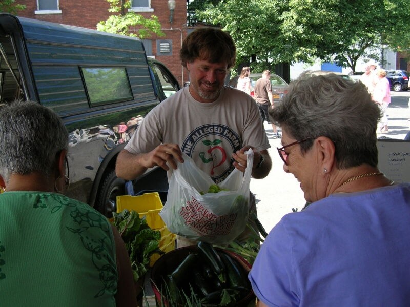Владимир Морозов: Да, публика пришла сюда не за дешевым товаром. В углу павильона продают модный сегодня греческий йогурт, который по вкусу и плотности больше напоминает сметану. На фермерском рынке пластиковая банка весом 900 граммов стоит 6 долларов. В пяти минутах езды отсюда - супермаркет ''Price Chopper'', в десяти - другой гигант - ''Wallmart''. Там тот же греческий йогурт по 4 доллара. В полтора раза дешевле. Я раскошелился и купил банку на рынке. Жена не одобрила и заявила, что греческий йогурт с базара слишком жирный, а в супермаркетах более полезный для здоровья – обезжиренный... На фермерском рынке, который отмечает сегодня свое 35-летие, торгуют не только фермеры. Вон ту высокую подвижную даму по имени Дебби я несколько раз встречал в библиотеке города Гленн-Фолз. Ее муж Чарлз Бейли профессор истории в колледже Адирондак.
