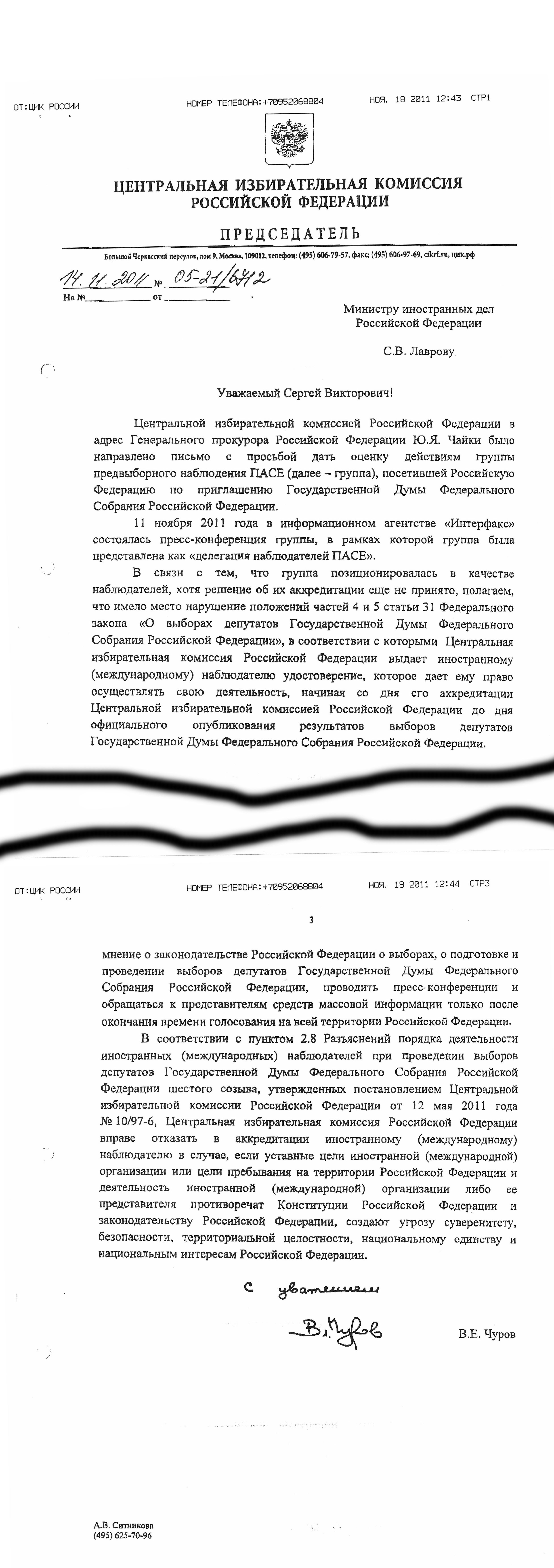 Во втором письме – к министру иностранных дел РФ Сергею Лаврову – глава Центризбиркома сообщает об обращении, направленном в Генпрокуратуру, рассказывает о претензиях, имеющихся у ЦИК к "группе предвыборного наблюдения" ПАСЕ и заключает: