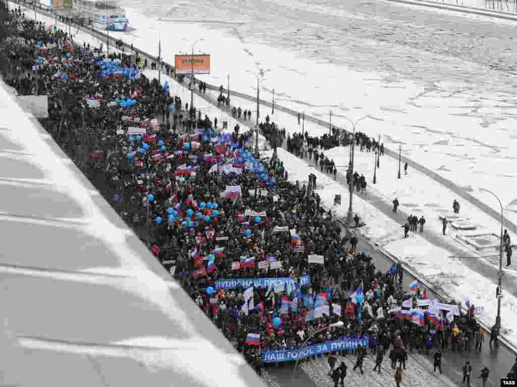Участники шествия и митинга "Защитим страну!" в поддержку кандидата в президенты России Владимира Путина у спорткомплекса "Лужники" 23 февраля в Москве