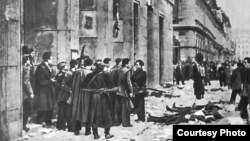 Диктор: Эта речь воспринимается студентами как призыв к действию. С возгласами "Долой Гере!" студенты вместе с большой толпой людей всех слоев и профессий идут к зданию будапештской радиостанции. Там их встречают войска госбезопасности. Встречают залпами. После этого толпы удержать нельзя. В руках демонстрантов появляется оружие, полученное ими от отдельных частей венгерской армии.
