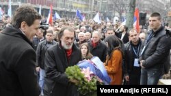 Айя Куге: Любопытно, что власти Белграда как будто скрывали от общественности, что 24 марта открывается новый памятник. Даже один из главных организаторов установки этого «мемориала», заместитель председателя парламента сербской столицы Зоран Алимпич отказался отвечать на вопросы журналистов. Очевидно, из-за того, что месяц назад его объяснение, данное нашему радио, вызвало бурю негодования. Он сказал тогда, что памятник устанавливается в честь всех: как убитых, так и убивавших в войнах.