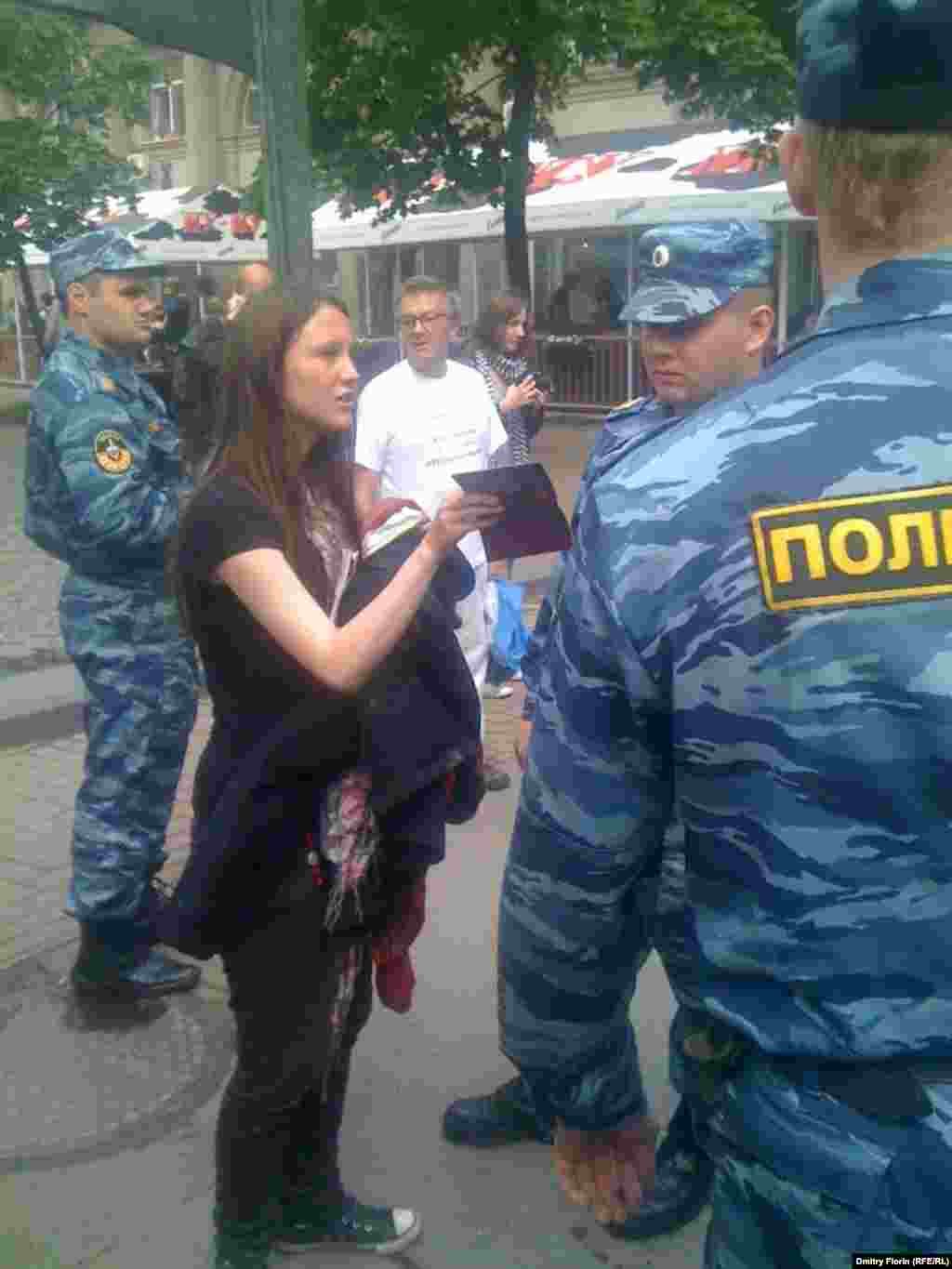 Гражданские активисты на Старом Арбате по очереди зачитывают закон о полиции
