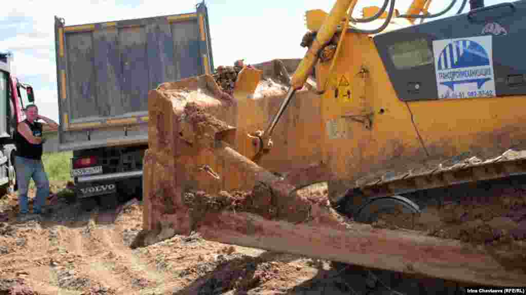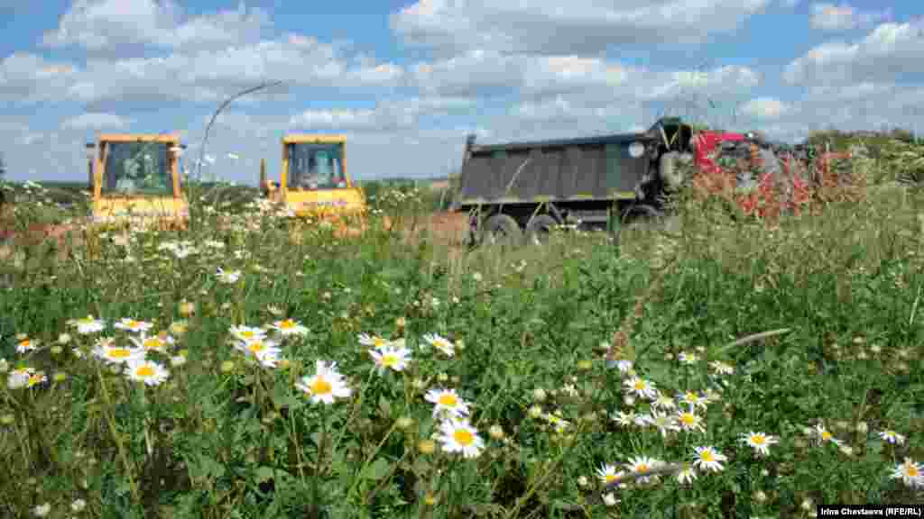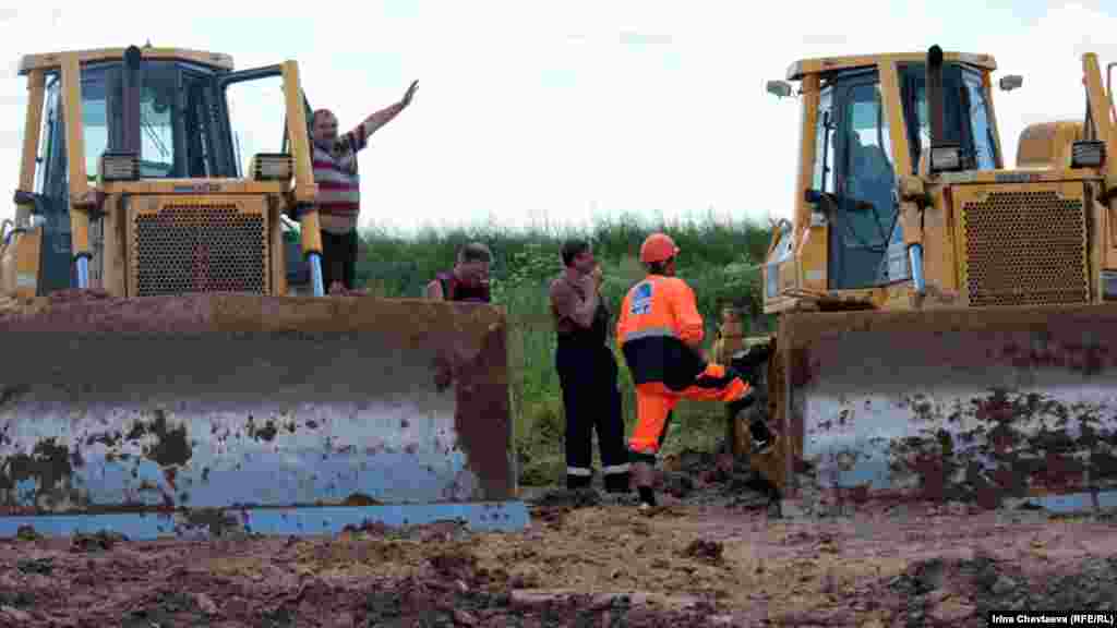 Недалеко от Шереметьевского шоссе засыпают русло реки Клязьма. Активисты пытаются препятствовать ведению этих работ.