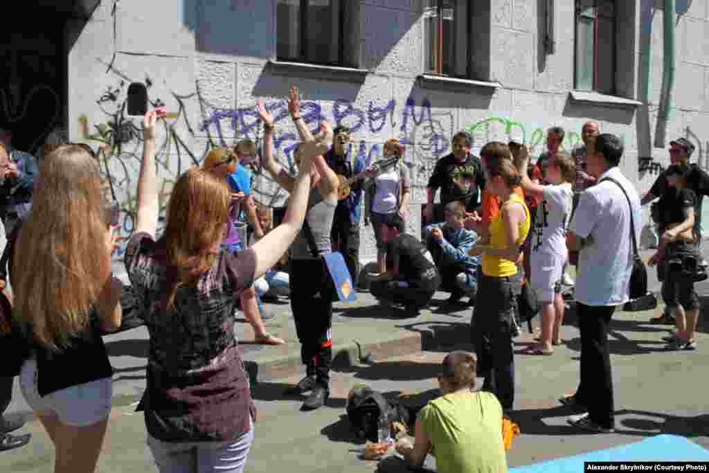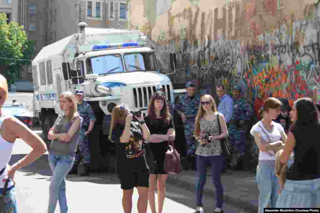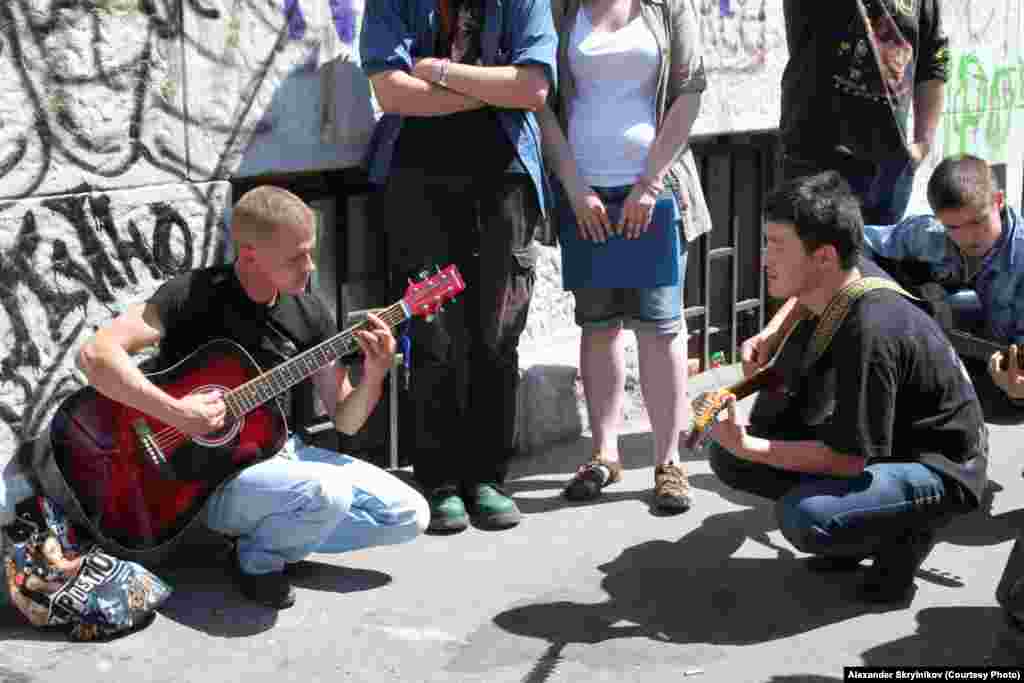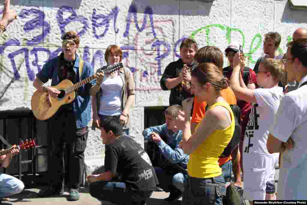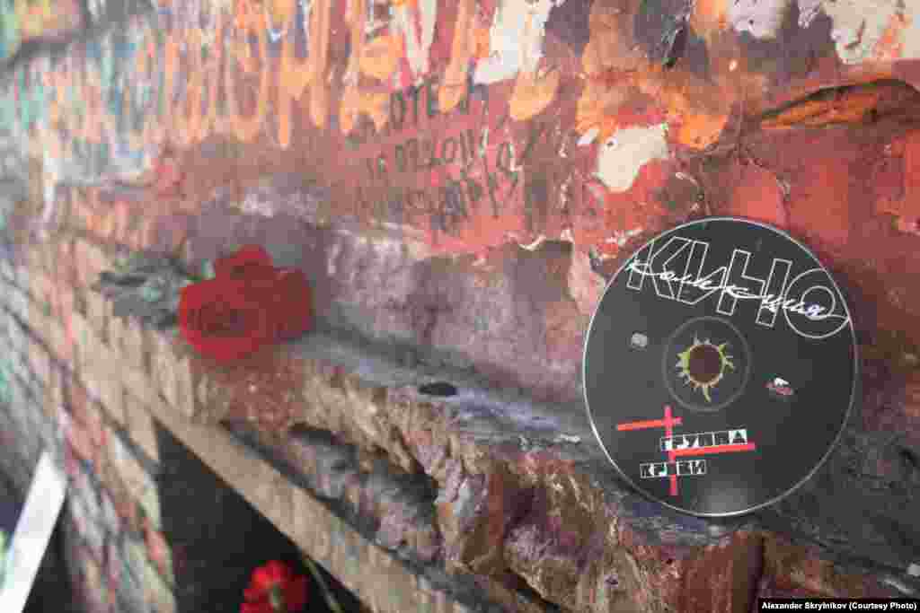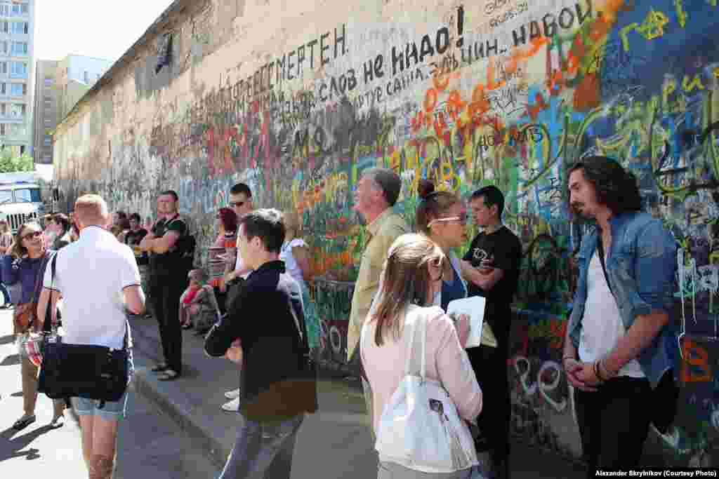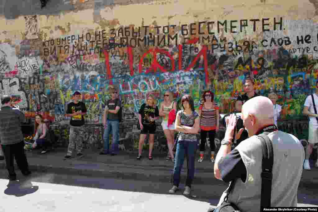 Поклонники творчества Виктора Цоя отмечают его юбилей у "стены Цоя" на Новом Арбате в Москве. Легендарному музыканту 21 июня исполнилось бы 50 лет. Фото Александра Скрыльникова.