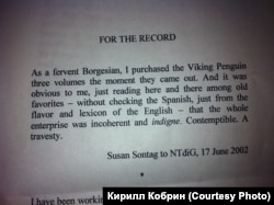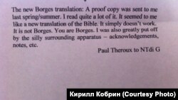 Вот, кстати, специально заготовленные Ди Джованни цитаты из этих писем Теру и Зонтаг; Норман передал мне их через Анну Асланян, которая брала у него интервью для Радио Свобода (оно прозвучало более трех лет назад в программе Дмитрия Волчека "Поверх Барьеров")