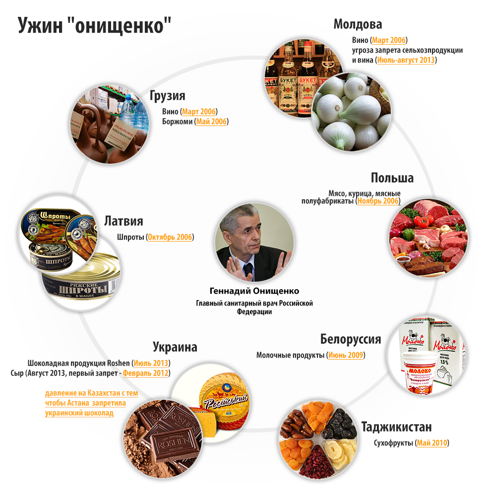 За последние десять лет огромное количество товаров подверглось запрету на ввоз в Россию. Часто российские санитарные нормы ужесточались в тот момент, когда у официальной Москвы появлялись другие, не продовольственные, проблемы с соответствующими государствами. Иногда это было сближение с ЕС и НАТО, иногда спор о какой-то военной базе, иногда дело касалось более крупных и даже стратегических для небольших стран предприятий и отраслей.