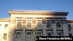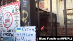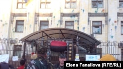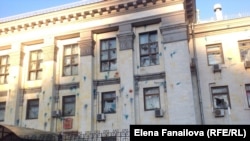 Фасад за время работы протестующих по закидыванию его яйцами, краской и камнями приобрел следующий вид.