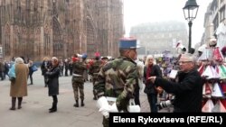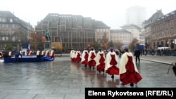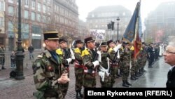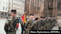 На параде выступил министр обороны Франции Жан Ив Ле Дриан. Перед этим он обошел все шеренги, выстроившиеся на площади Клебер. Он немножко похож на Виталия Коротича. Я, конечно, не понимала, что он говорит, но потом прочла. Он заявляет, что те жгучие бои, которые развернулись в Страсбурге 70 лет назад, приобретают особую актуальность сейчас, во время борьбы против вооруженных исламских движений. Говорит, что за семьдесят лет мир значительно изменился, однако "наш общий враг, под разными лицами, оставался тем же: нетерпимость, расизм, фанатизм, варварство" и этот враг "сеет тот же ужас среди населения Европы". Он также заявляет, что Франция разделяет всю полноту ответственности в этом бою своими военными операциями в Мали, в Центрально-Африканской Республике, в Индийском океане и в последнее время также в Ираке, принимая участие в воздушных ударах против радикальных исламистов. Это идут представители именно современной французской армии.