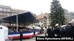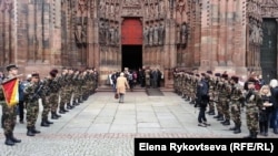 Дело в том, что еще в 1941 году генерал Лекруа заставил своих воинов произносить клятву: "Поклянитесь в том, что вы сложите оружие только тогда, когда наши цвета, наши красивые цвета, будут плыть над собором Страсбурга". Сегодня случилась эта символическая акция. Был туман, поэтому ее детали можно было разглядеть только по местному телевидению. Над собором с флагом Франции кружило какое-то летательное устройство, похожее на большого паука. Потом этот флаг сняли и внесли в собор. Туда же с парада пришли ветераны со своими знаменами. Состоялось торжественное богослужение памяти павших.