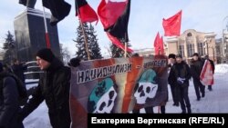 Был еще один баннер, с надписью: "Борьбе наций – нет! Борьбе классов – да!". Это иркутские коммунисты поддержали акцию анархистов и антифашистов. За пять лет, что антифашисты проводят подобные мероприятия, это произошло впервые.