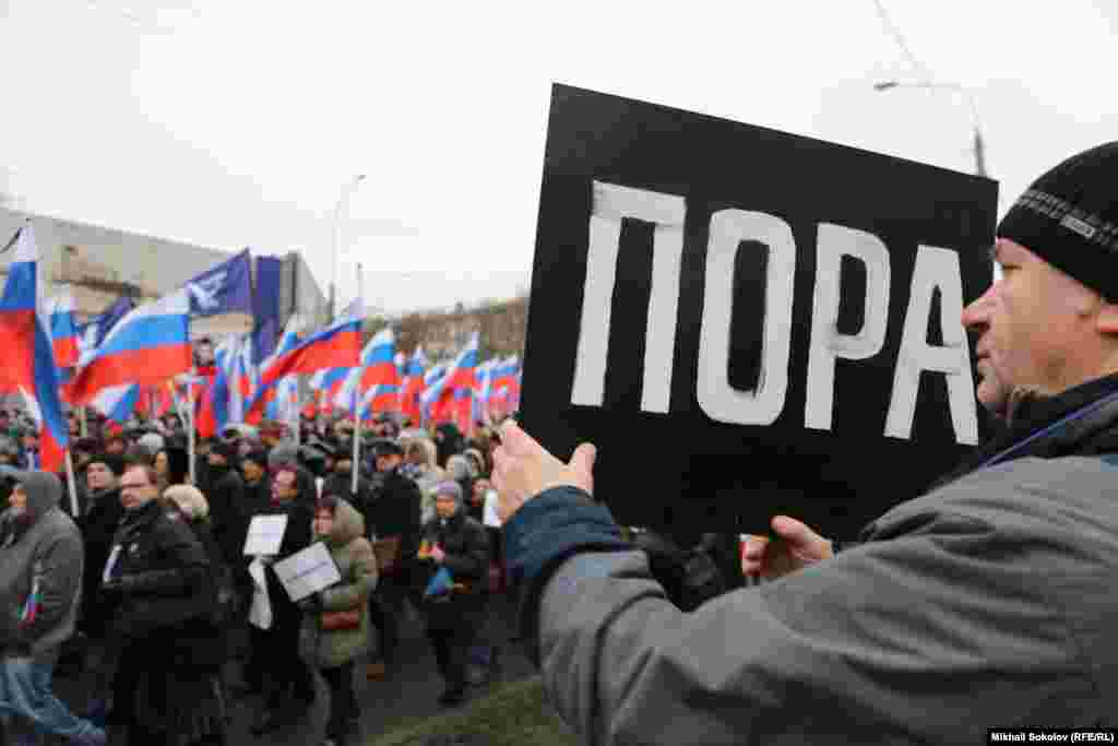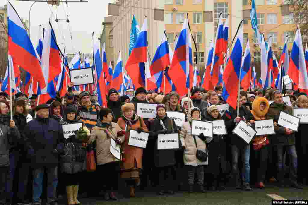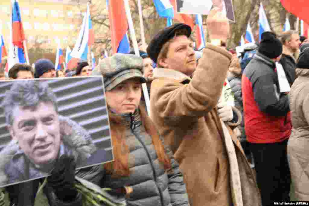 В Москве прошел многотысячный марш памяти убитого лидера демократической оппозиции Бориса Немцова. Участники шествия несли плакаты с его изображением. Немцов был застрелен в ночь на субботу в центре Москвы.