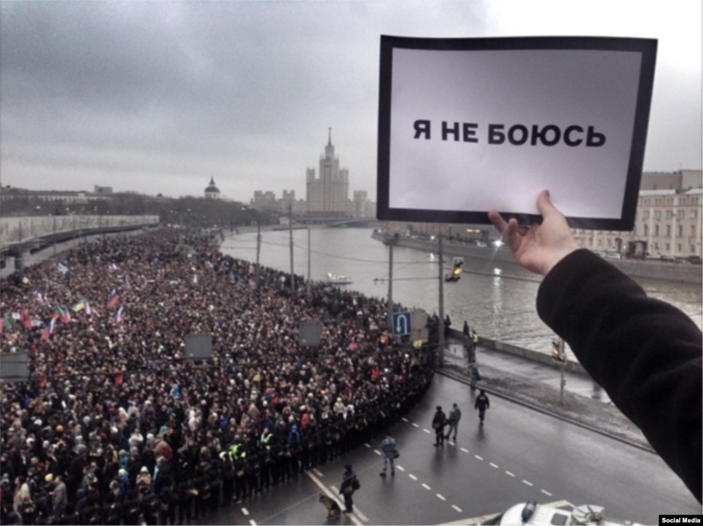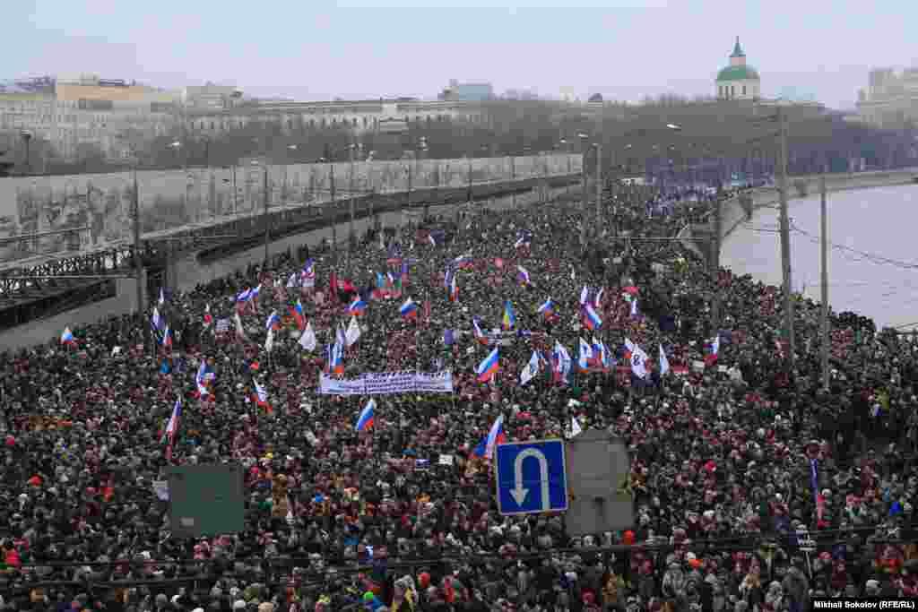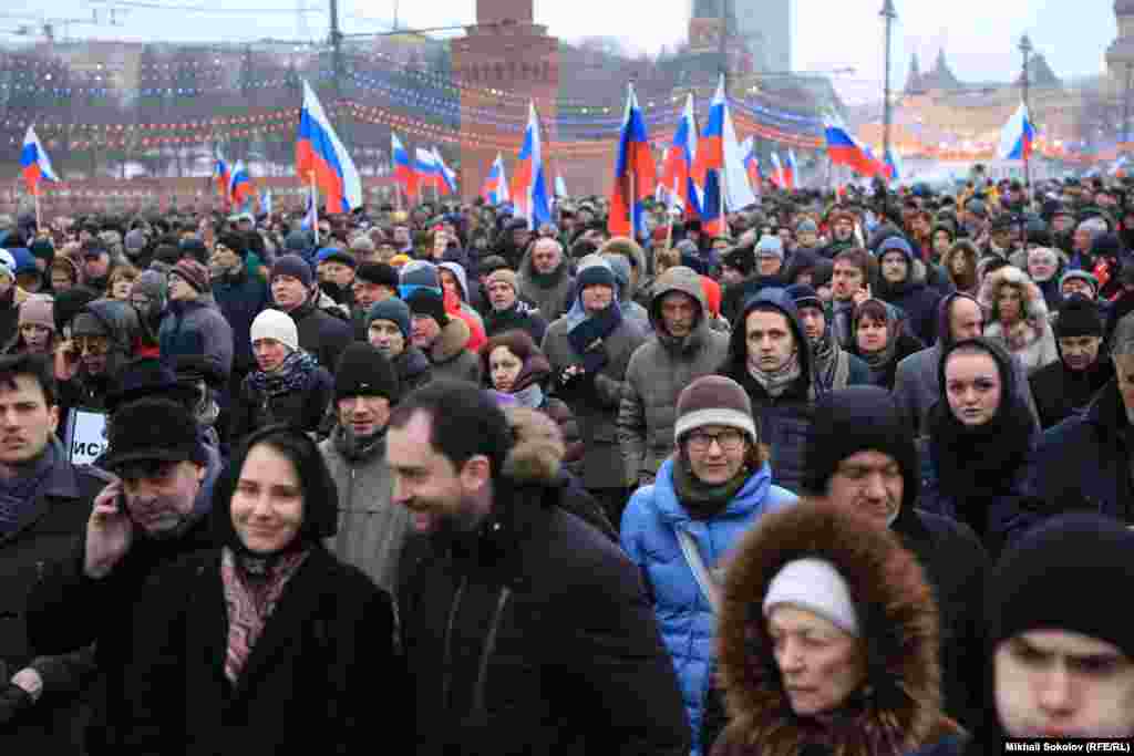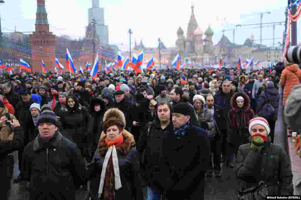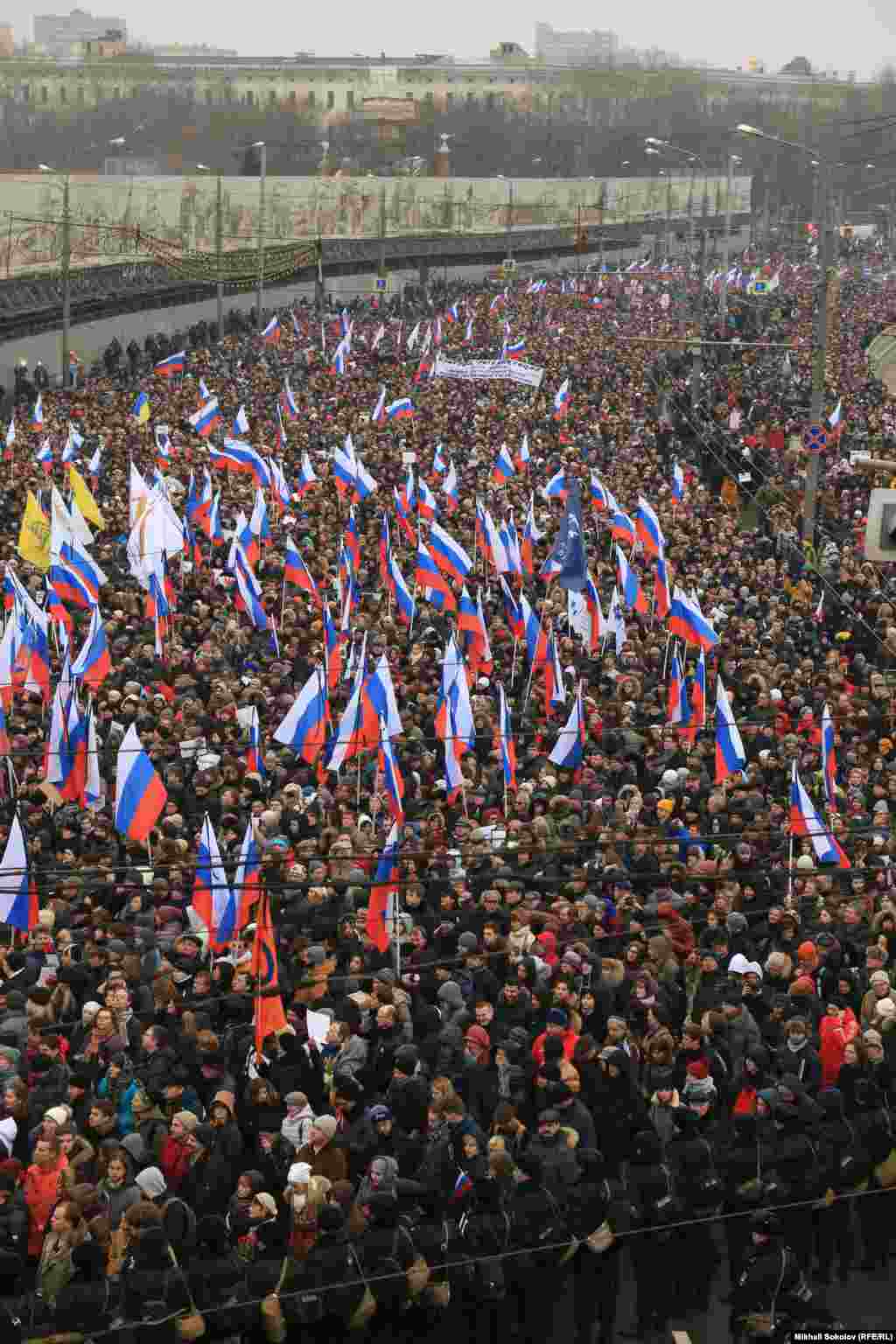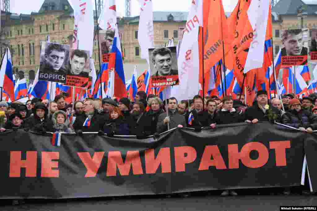 В Москве прошел многотысячный марш памяти убитого лидера демократической оппозиции Бориса Немцова. Участники шествия несли плакаты с его изображением. Немцов был застрелен в ночь на субботу в центре Москвы.