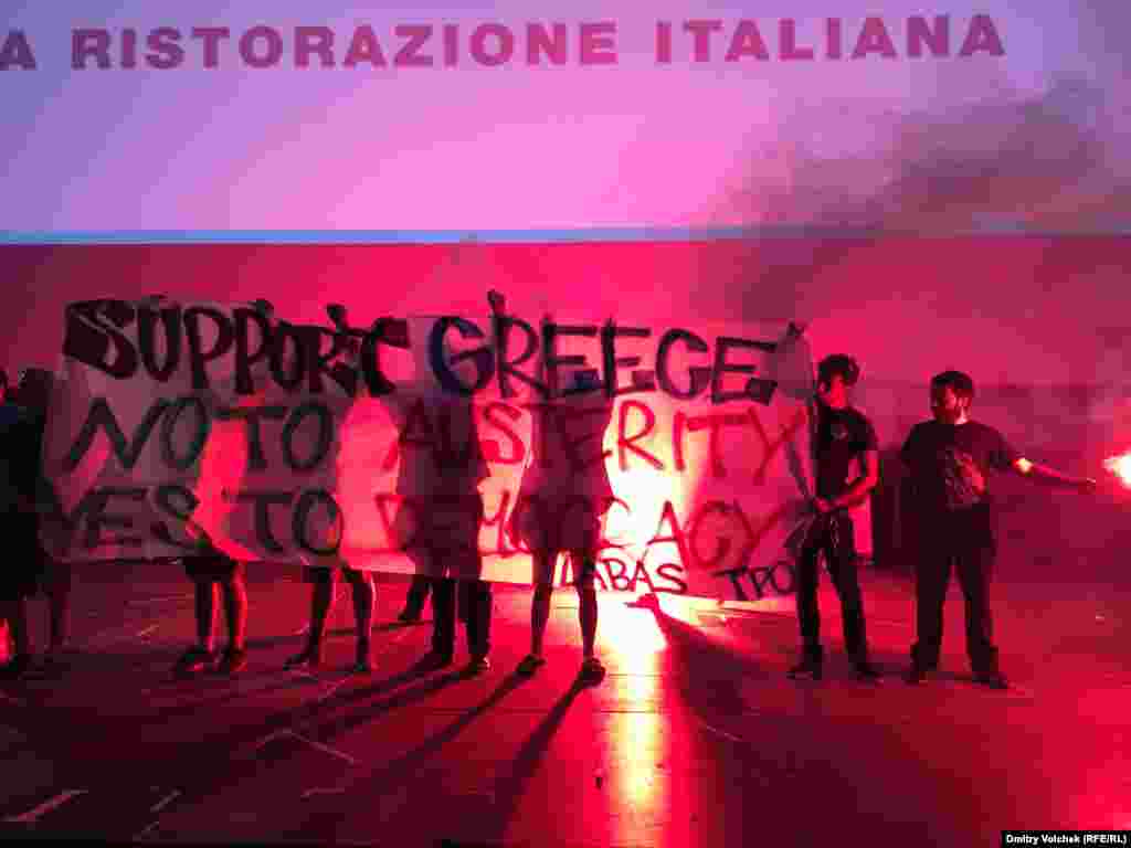 Перед показом фильма "Касабланка" на главной площади Болоньи на сцену, сметая охрану, вырвалась группа антиглобалистов. Они развернули плакат в поддержку Греции. Акция продолжалась несколько минут, протестующие скрылись, и вскоре на сцене появилась Изабелла Росселини, представившая картину, в которой снималась ее мать