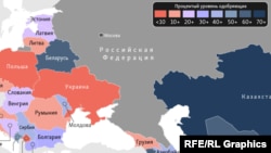 В то же время сама Россия стала единственной из пяти рассматривавшихся держав, чей отрицательный рейтинг оказался в среднем выше положительного: соответственно 36 и 22 процента. Ниже - более подробно о том, как оценивали действия российского руководства в соседних с Россией странах бывшего СССР и Восточной Европы