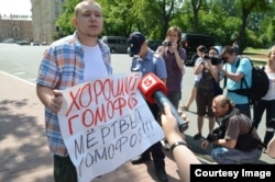 – В связи с тем, что на первом пикете, который я устраивал в Липецке, я вышел с плакатом, на котором было написано: "Хороший гомофоб – мертвый гомофоб". Но прокуратура не нашла в этом лозунге в итоге никакого экстремизма. Смешно, что я просто перепутал плакаты, этот плакат у меня лежал с Питера, мы нарисовали другой плакат для акции, а я случайно взял снова этот.