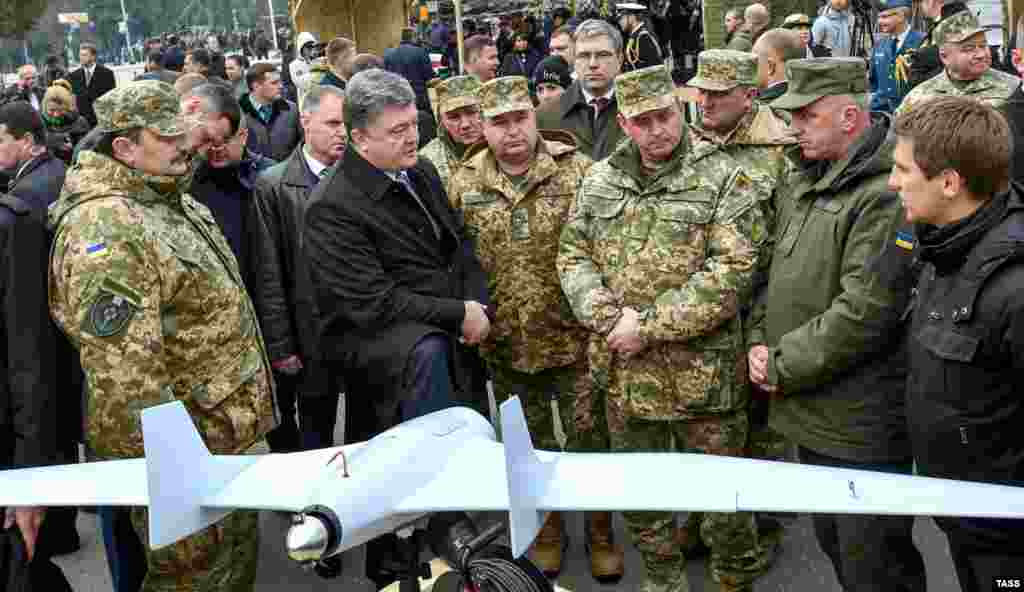 Петр Порошенко 14 октября посетил выставку военной техники в Киеве. Он стоит рядом с национальным флагом, привезенным из зоны вооруженного конфликта в Донбассе.