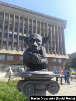 Незадолго до рождения Говорящей лошади в Запорожье появился удивительный памятник: печальное существо, похожее на Владимира Путина, обнимает мертвого снегиря. К скульптуре прилагалась табличка с надписью, стилизованной под старославянскую письменность: "Сей памятник воздвигнут в знак скорби "русскаго мира" о злодейски убиенных жидобандеровцами русскоязычных снегирях". Бизнесмен Максим Дрозденко, по инициативе которого воздвигли этот монумент, объяснял его смысл так: