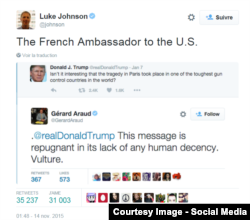 Твит Дональда Трампа. Посол Франции оставил возмущенный комментарий на этот твит Дональда Трампа: "Обратите внимание, что трагедия в Париже случилась в стране, где ограничения на владение оружием – одни из строжайших в мире".