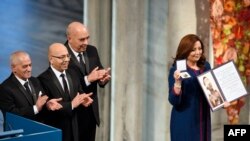 Нобелевские дипломы и медали вручила председатель Норвежского нобелевского комитета Карин Сисилле Кулльман Фиве.