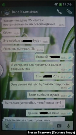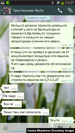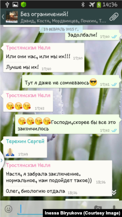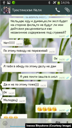"Нель, щас еду и думаю, если эксп будет на стороне фила, то не будут ли мои действия расцениваться как незаконное содержание под стражей?" – спрашивает она Тростянскую 16 февраля 2015 года.