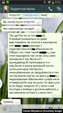 "Так да!!! Но это ж тип х***о Я вообще изначально их даже арестовывать не хотела а кашкарина тип ни***, похер, выходи с ходатайством. И *** обвинение по 158 <158 статья УК РФ – кража. – Прим. ред.>, вот это тоже такой ****… при этом кашкарина так хитро эопу свою прикрыла. У нас была сог – я, она, давид <СОГ – следственно-оперативная группа. – Прим. ред.>. 91 выписывали я и она <91 статья УК РФ, регламентирующая основания, по которым можно задержать подозреваемого. – Прим. ред.>. Потом я взяла выходной после суток, она одна там была с ними, обвинение не предъявила а типа согласовала ход-во на арест, а **** с недоказанным обвинением сучара меня отправила! Но она не учла тот факт, что если будут вопросы-то у меня стаж полгода и вообще я должна работать с наставником которого у меня нет", – Баряева жалуется, что ее руководитель, начальник СО Кашкарина, не стала предъявлять подозреваемым обвинение, оставив это ей, переложив на нее и всю ответственность.